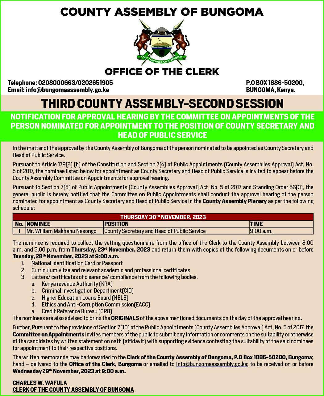 Pursuant to Article 179(2) (b) of the Constitution and Section 7(4) of Public Appointments (County Assemblies Approval) Act, No. 5 of 2017, the nominee listed below for appointment as County Secretary and Head of Public Service is invited to appear before the County Assembly Committee on Appointments for approval hearing.